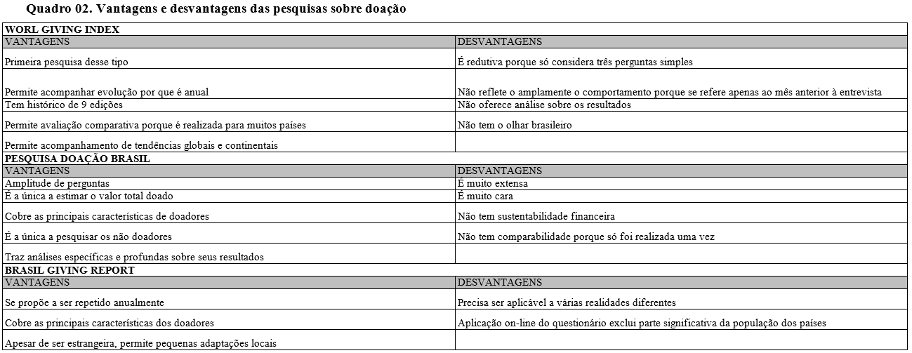 Entre as diversas publicações indicadas na Bibliografia, existem duas de especial interesse para quem quer saber mais sobre o estado da cultura de doação no Brasil, pois trazem conteúdo mais reflexivo do que quantitativo. O primeiro deles é a publicação da Pesquisa Doação Brasil, que além de apresentar os resultados do levantamento, também contém artigos que analisam os dados sob diferentes pontos de vista. O olhar psicanalítico, o olhar de uma especialista em pesquisas e o olhar de um acadêmico do campo do Terceiro Setor. Esses três textos, além de outras reflexões dos profissionais envolvidos na realização da pesquisa ajudam a ampliar o conhecimento trazido pelos números.