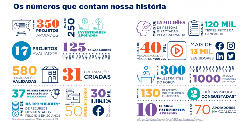 5. Reuniões com representantes do Congresso e autoridades governamentais em vários departamentos, incluindo a Secretaria Geral da Presidência, representantes da Câmara dos Deputados, Senado Federal, BID, BNDES, Ministério da Educação, Cultura e Economia. Ao longo de seis anos, o IDIS sediou eventos e promoveu diálogos que resultaram em 11 projetos de Lei no Congresso Nacional que buscavam regulamentar os Fundos Patrimoniais no Brasil.