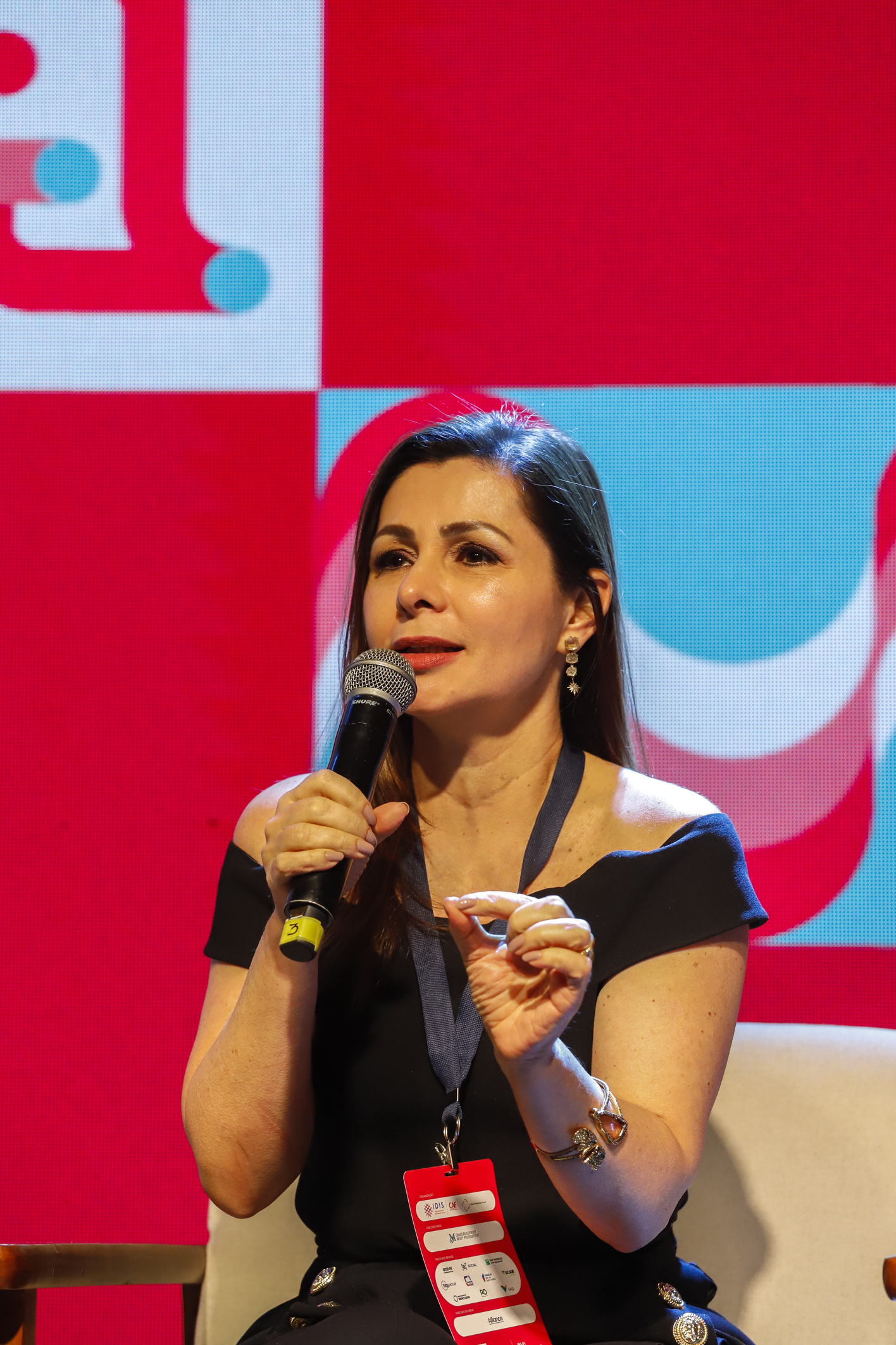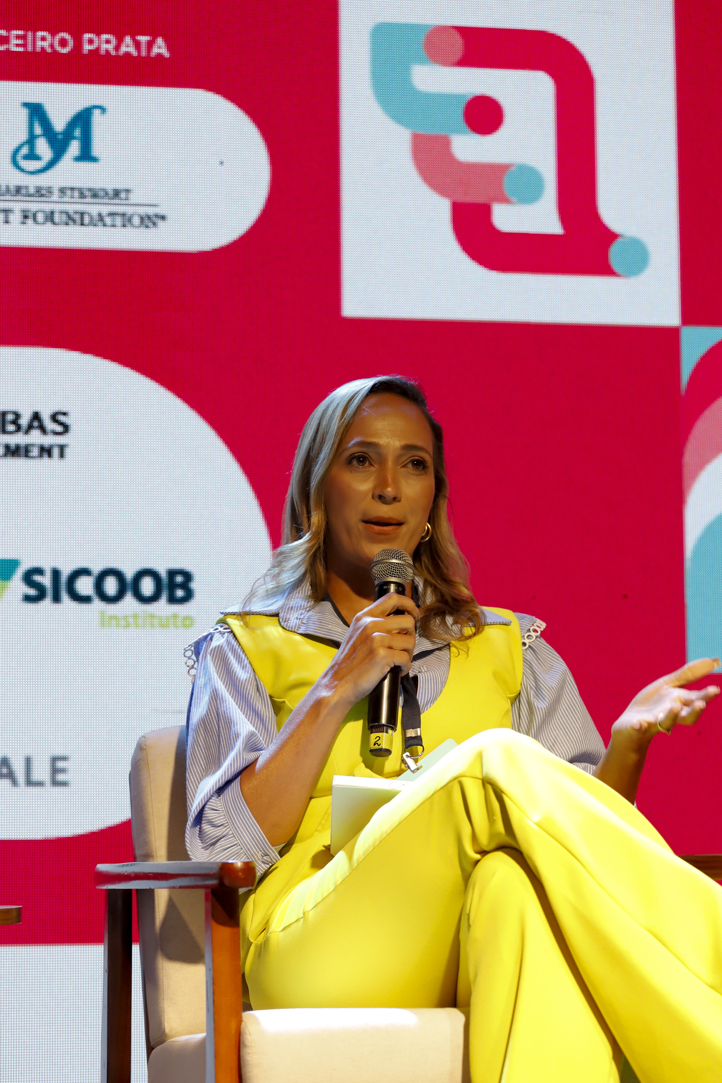 apresentar sua experiência e os desafios enfrentados na instituição. Para ela, o risco é essencial para a inovação e o erro é uma fonte de informação que alimenta o próximo passo a ser dado. Ela mencionou o projeto desenvolvido durante a pandemia em parceria com a rede Accor, que utilizou os hotéis como abrigos para mulheres vítimas de violência, evidenciando a responsabilidade que atores sociais possuem em inovar.
