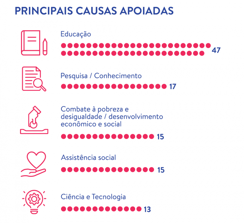 A Educação continua a ser a causa mais apoiada, com 47 fundos destinando recursos para o setor. Em seguida, pesquisa e conhecimento, desigualdade / desenvolvimento econômico e social e assistência social. A maior parte dos fundos está concentrada no eixo Rio-São Paulo, com São Paulo respondendo por 69% do total de participantes do levantamento.
