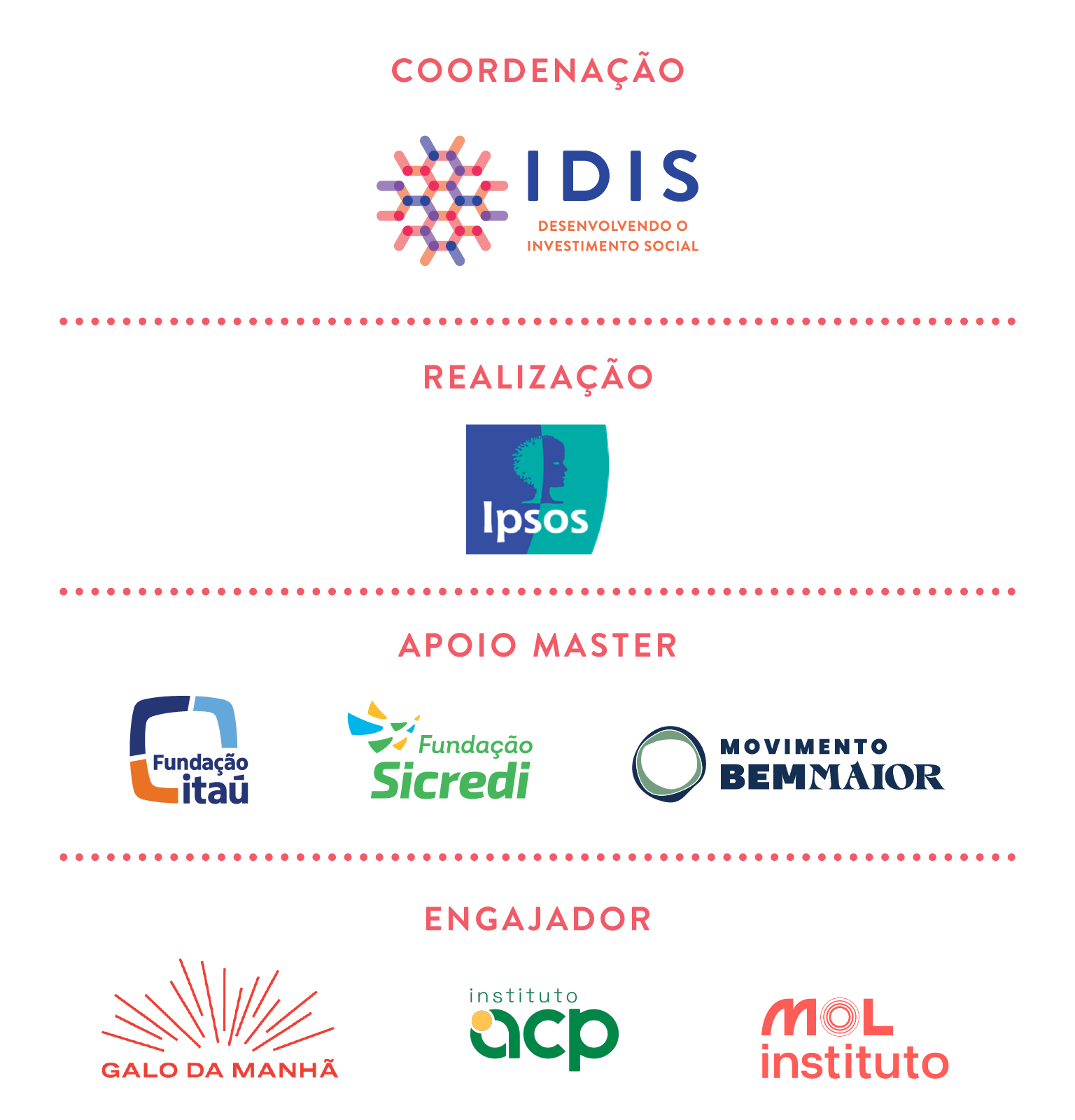 A Pesquisa Doação Brasil 2024 é uma iniciativa do IDIS – Instituto para o Desenvolvimento para o Investimento Social. A realização é da Ipsos e conta com o apoio da Fundação Bradesco, Fundação Itaú, Fundação Sicredi, Movimento Bem Maior, Instituto Galo da Manhã, Instituto ACP e Instituto MOL. Deixamos também agradecimentos especiais à Sra. Teresa Bracher.