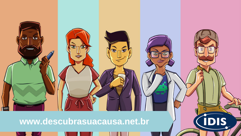 Nossos cinco personagens são a Flora, o Beto, o Nelson, a Catarina e o Yama. Cada um deles tem uma (ou mais) diferentes causas, a Flora, por exemplo atua na defesa do meio ambiente e na proteção dos animais. O Beto é preocupado com a acessibilidade e a mobilidade urbana, o Nelson luta contra a desigualdade racial, social, de todos os tipos, a Catarina, por sua vez é cientista e apoia organizações que promovam acesso à ciência e tecnologia. Por fim, o Yama, apoia a causa da geração de emprego e renda.