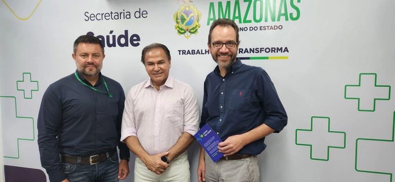 Alfredo Lins, Secretário do Escritório de Representação do Estado do Amazonas em São Paulo, Dr. Anoar Samad, Secretário de Saúde do Amazonas e Guilherme Sylos, Diretor de Prospecção e Parcerias do IDIS, na Sede da Secretaria de Estado de Saúde do Amazonas.