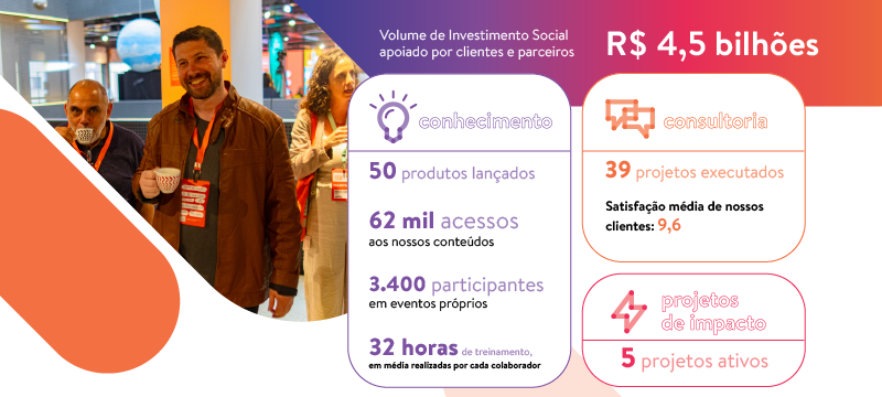Seja entre iniciativas internas ou em colaborações com outras organizações do setor, a coletividade deu propulsão à nossa atuação baseada no tripé de geração de conhecimento, consultoria e projetos de impacto. Durante esse caminho, continuamos com nossa missão de inspirar, apoiar e ampliar o investimento social privado e seu impacto. As histórias foram reunidas em nosso Relatório de Atividades.