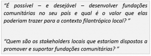 No conceito da Mott Foundation, Fundações Comunitárias são organizações filantrópicas com uma agenda ampla e múltipla de causas que contribuem para o desenvolvimento comunitário, comprometidas com resultados de longo prazo e focadas em uma área geográfica específica. Seu objetivo é melhorar a vida das pessoas da região onde atua por meio da mobilização e distribuição de ativos locais e da atração de investidores. São organizações que funcionam como um veículo para o exercício da cidadania dos moradores locais, já que criam espaço para debate sobre as prioridades locais e para a tomada de decisão sobre o uso dos recursos captados. De acordo com James Magowan, Diretor da European Community Foundation Initiative, que foi um dos palestrantes do workshop, as Fundações Comunitárias atuam dentro do modelo de “bounding, bridging & linking”, ou seja, possuem um papel articulador que estimula e promove laços, pontes e conexões entre os diversos atores de uma comunidade.