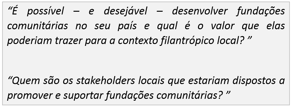Com base no resultado dessa pesquisa, a Mott espera ser capaz de selecionar alguns dos países como alvo de uma iniciativa de fomento às Fundações Comunitárias. O workshop marcou a início desse trabalho e, para contribuir com os pesquisadores, a Mott convidou pessoas e organizações que já receberam grants no passado para desenvolver Fundações Comunitárias em seus países e tiveram sucesso.