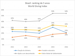 O World Giving Index, divulgado no Brasil pelo IDIS, é um estudo anual sobre o comportamento global de solidariedade baseado em pesquisas realizadas em 145 países, analisando três indicadores de doação: a porcentagem de pessoas que fizeram doações em dinheiro, dedicaram tempo de voluntariado e ajudaram um desconhecido no último mês anterior à pesquisa. O Brasil caiu 15 posições no índice, saindo da 90ª para a 105ª posição.