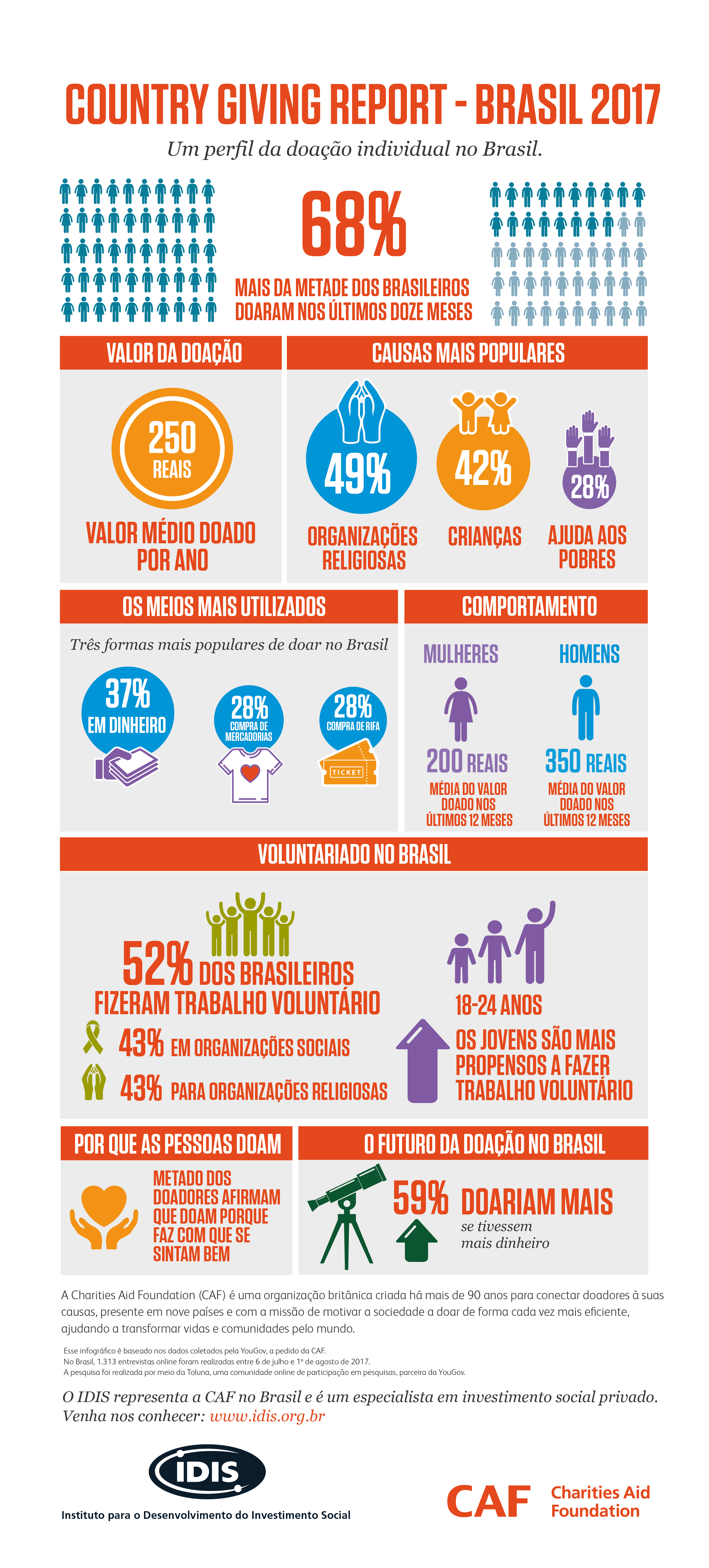 Para revelar o comportamento do doador individual, os pesquisadores ouviram 1.313 pessoas em todo o território nacional – todos maiores de 18 anos e com acesso à Internet. O IDIS trouxe a pesquisa Country Giving Report 2017 para o País com a certeza de que o conhecimento e a reflexão sobre o comportamento do doador são armas poderosas para fazer da doação um tema mais presente nas pautas públicas e privadas do Brasil. A importância de pesquisas que nos ajudam a entender as motivações de um doador fica clara no espaço que esse tipo de estudo recebe nas mídias. Você pode acompanhar algumas das repercussões no programa Estúdio i, da Globonews, e no Jornal da Cultura Primeira Edição.  Basta clicar, aos 20’29” em http://tvcultura.com.br/videos/63333_jornal-da-cultura-1a-edicao-14-11-2017.html . E ainda em  http://g1.globo.com/globo-news/estudio-i/videos/v/pesquisa-mostra-que-68-dos-brasileiros-fizeram-caridade-no-ultimo-ano/6285787/