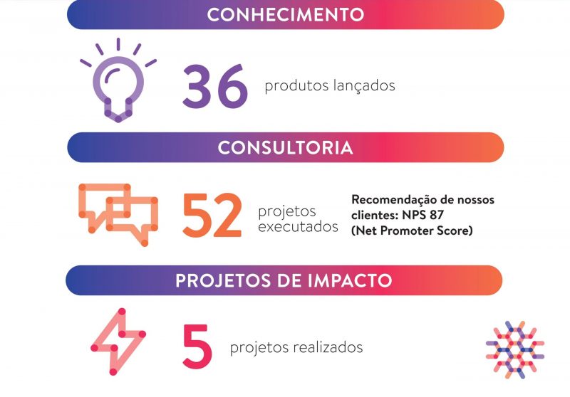 O nosso tripé de atuação consultoria, projetos de impacto e conhecimento se consolidou. Foram mais de 50 projetos executados com focos diversos como planejamento estratégico, estruturação de fundos patrimoniais, gestão da doação e avaliação de impacto.