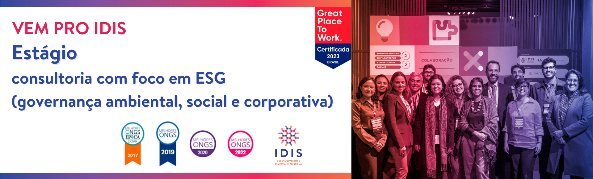 Organização com mais de 26 anos de história, o IDIS – Instituto para o Desenvolvimento do Investimento Social busca estagiários para integrarem sua equipe. Por meio de experiência prática, os jovens poderão aprender e se desenvolver em temas relacionados ao investimento social privado, cultura de doação e terceiro setor. Em suas atividades, apoiarão o direcionamento adequado de doações realizadas por empresas, famílias e organizações da sociedade civil (OSCs), contribuindo para diferentes causas e para impacto social positivo.