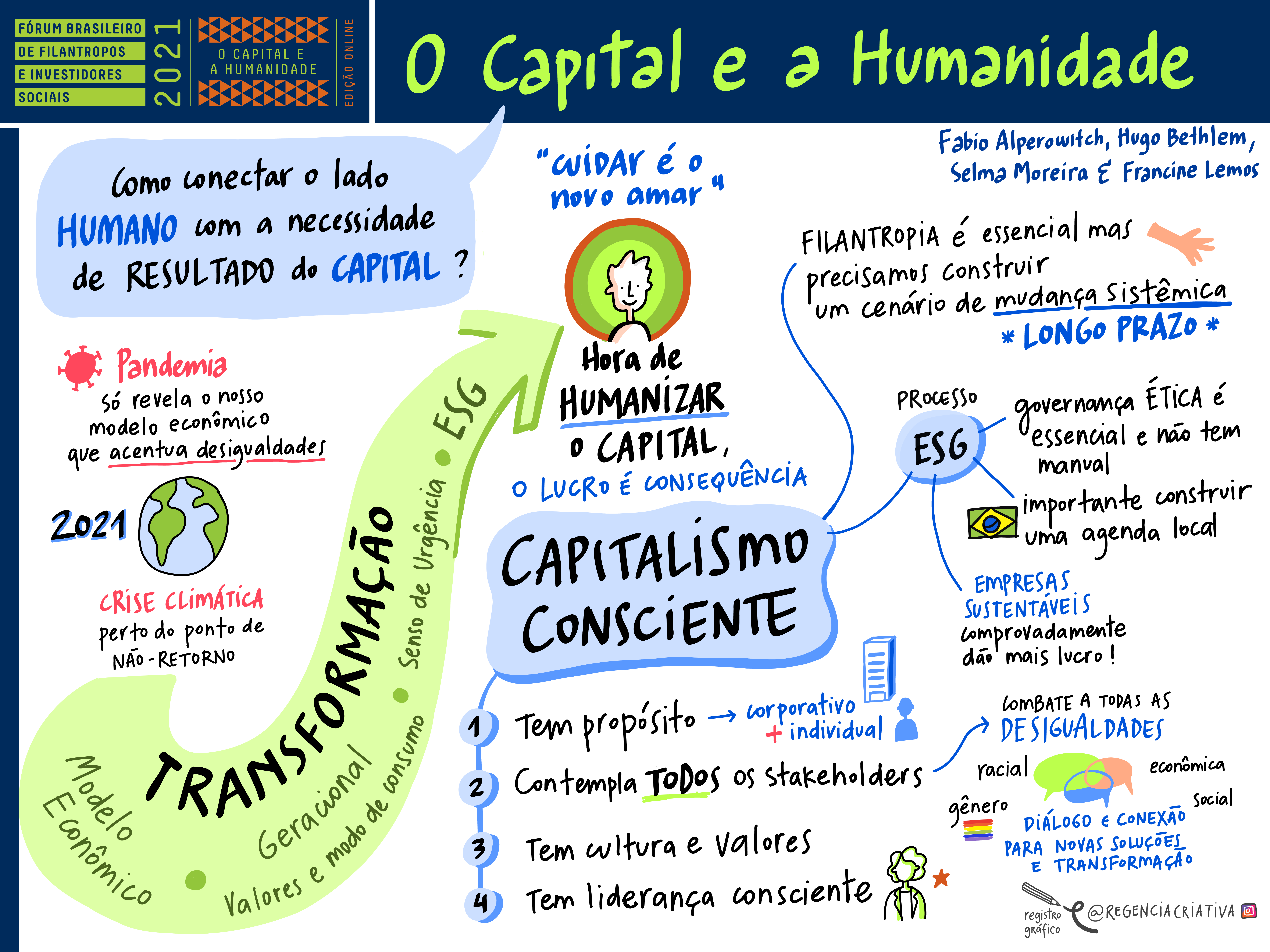 Com o desafio de debater o tema homônimo ao evento, a plenária O Capital e a Humanidade (assista aqui) reuniu Fábio Alperowitch (fundador da Fama Investimentos e diretor do Instituto FAMA), Hugo Bethlem (cofundador e presidente do Conselho do Instituto Capitalismo Consciente), Selma Moreira (diretora executiva do Fundo Baobá) e Francine Lemos (diretora executiva do Sistema B Brasil), responsável pela moderação. A agenda ESG (Ambiental, Social e Governança), os impactos da pandemia do coronavírus e as desigualdades estavam presentes nas falas dos palestrantes. Entre os destaques, a constação de Alperowitch “Elas [as empresas] estão se perguntando se o papel delas é só vender ou envolve algo mais: cuidar dos colaboradores e do entorno sem esquecer-se que a empresa visa rendimento e lucro, e que é possível fazer isso de forma combinada”.