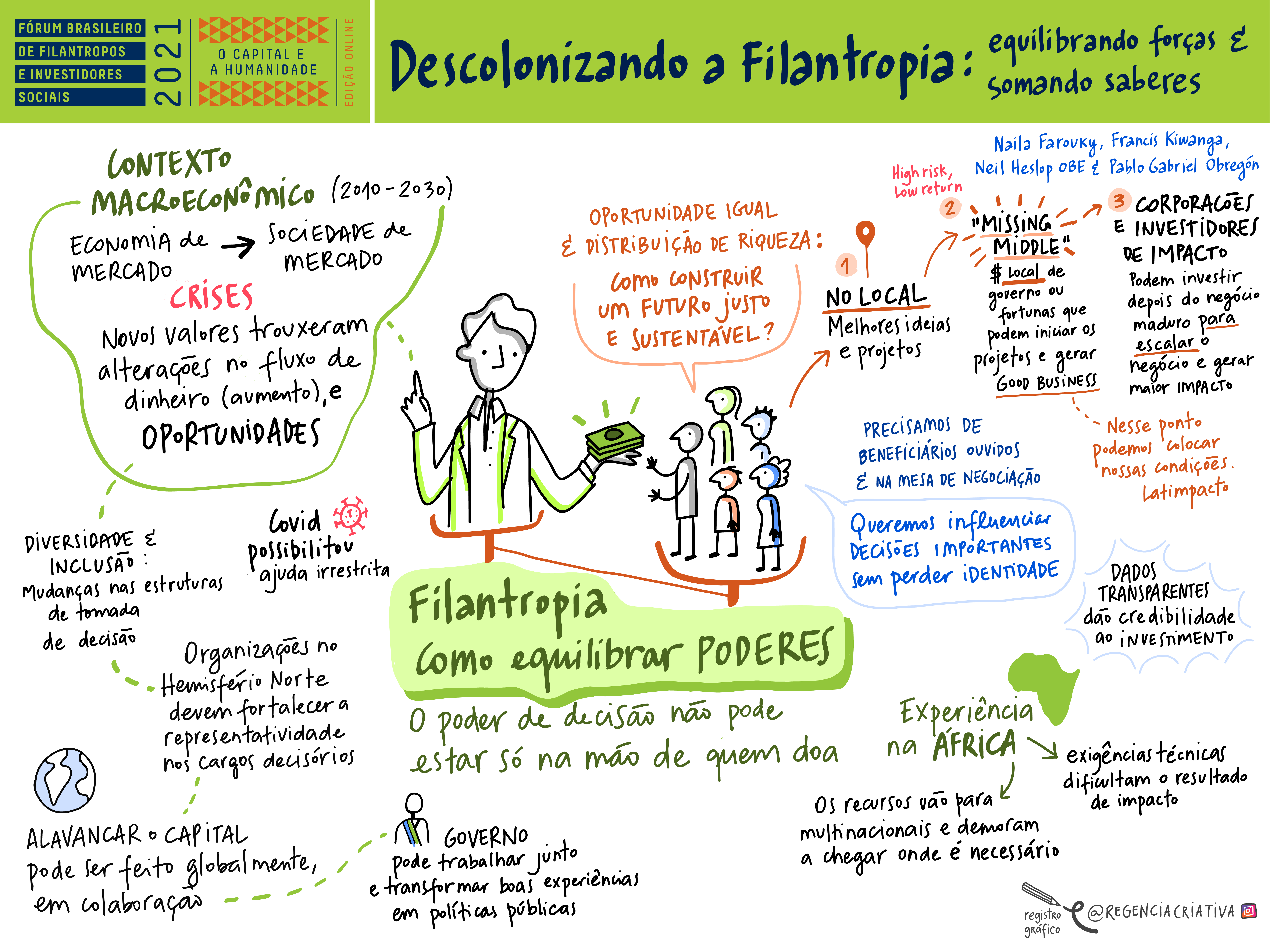 O plenária de encerramento reuniu palestrante internacionais para debater o tema ‘Descolonizando a Filantropia: equilibrando forças e somando saberes’. Neste painel, Francis Kiwanga, diretor executivo da Foundation for Civil Society (Tanzânia), Neil Heslop OBE, CEO da Charities Aid Foundation (Inglaterra) e Pablo Gabriel Obregón, Presidente da Fundação Mario Santo Domingo e presidente do Conselho da Latimpacto (Colômbia) trouxeram pontos de vista complementares, traçando um cenário verdadeiramente global. A moderação foi feita por Naila Farouky, CEO do Fórum Árabe de Fundações (Egito). “Os tempos estão mudando e há interesse em investir no desenvolvimento das comunidades locais.”, destacou Pablo Obregón.