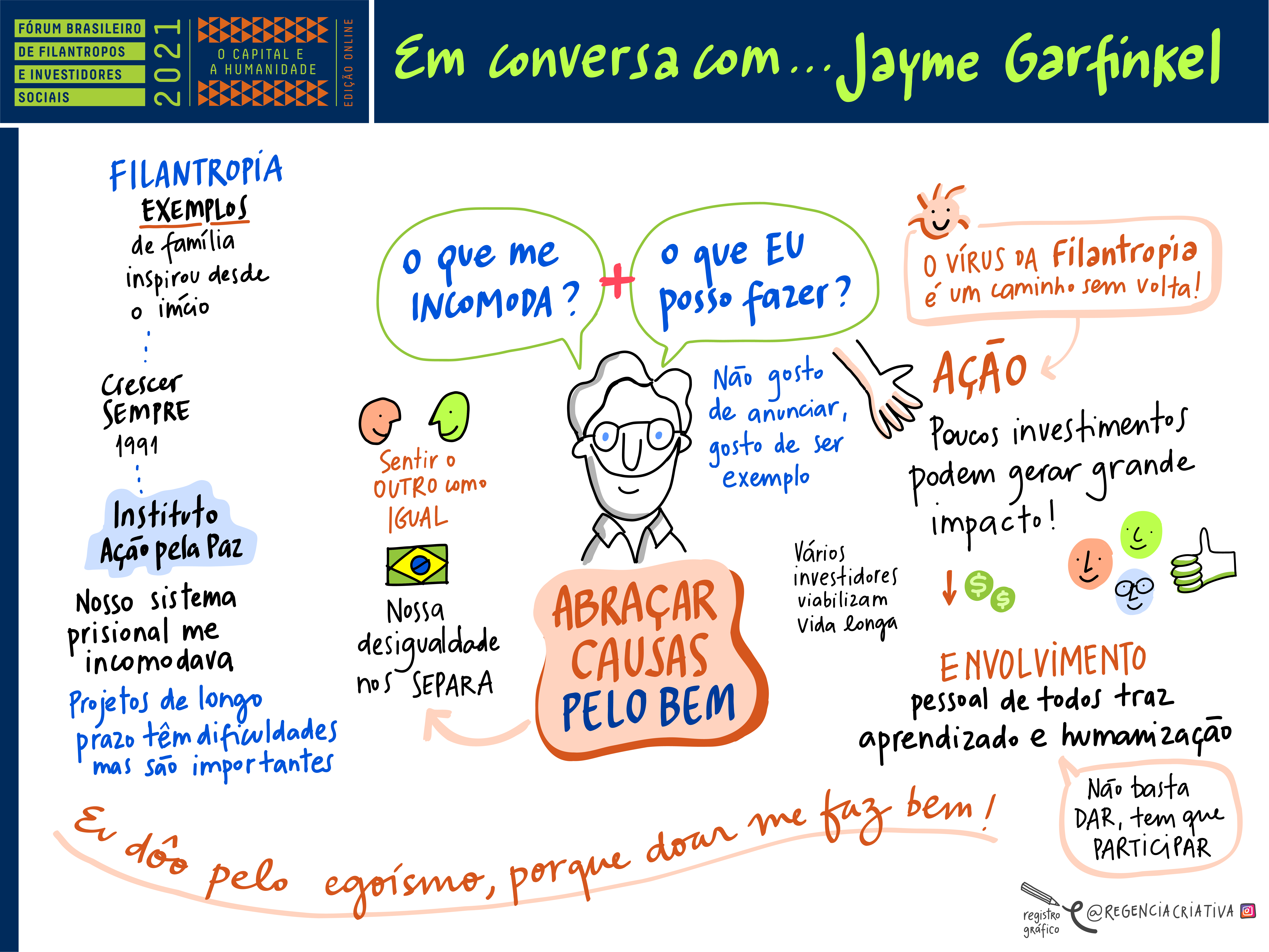 Já na tradicional mesa ‘Em conversa com…’, o entrevistado Jayme Garfinkel, filantropo e ex-presidente da Porto Seguro, inspirou o público ao falar sobre os projetos que desenvolve nas áreas da educação e de reinserção social de egressos do sistema prisional e afirmou: “Não me sentiria humano se eu não fizesse o bem. Se você pode fazer o bem, faça. Esse é o espírito que eu quero passar, cada um tem que fazer sua parte”. (assista aqui)