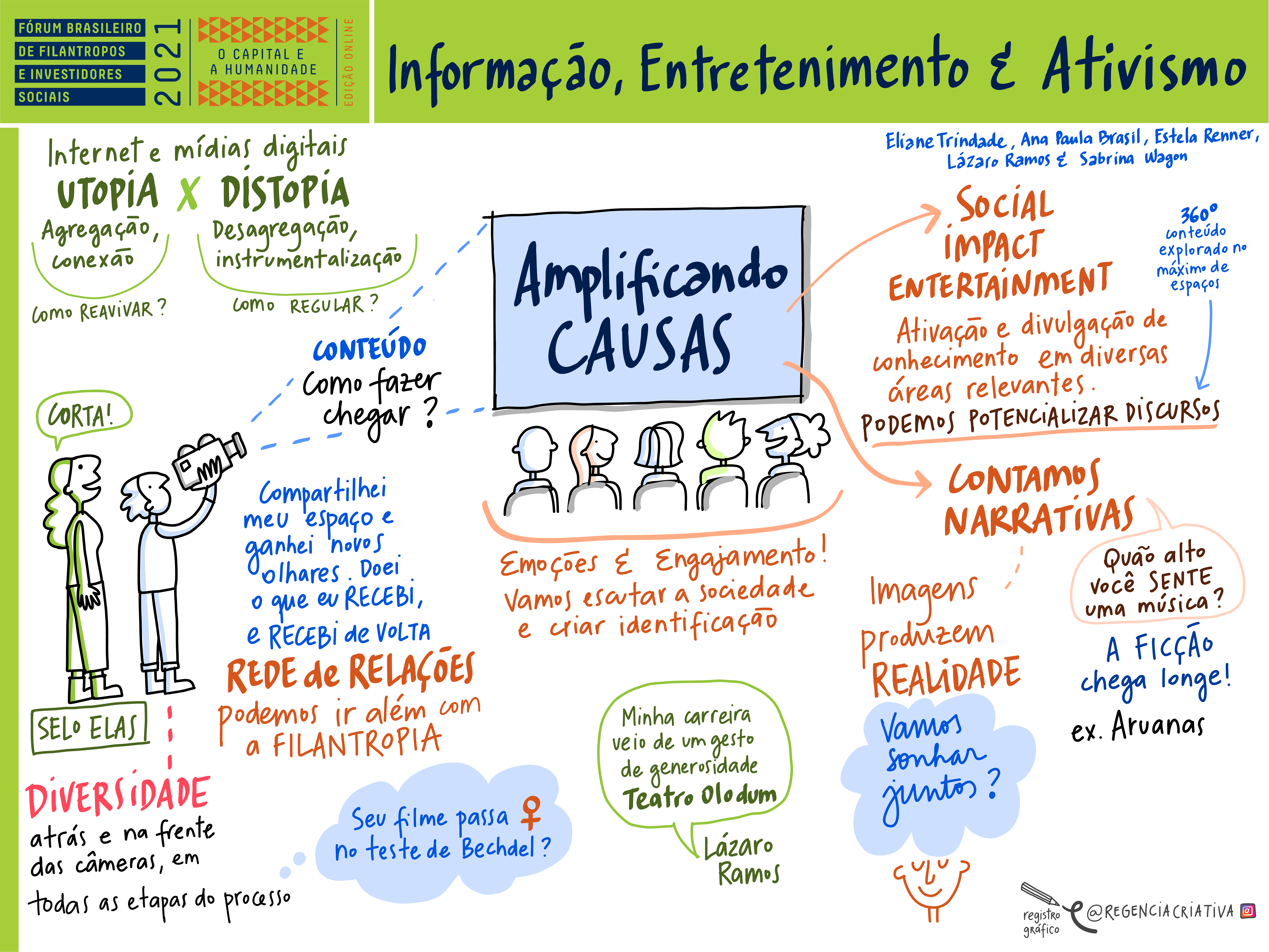 O segundo dia do Fórum começou animado, com um set do DJ Alok, que também falou sobre seu recente ingresso na filantropia. A plenária seguinte, ‘Informação, Entretenimento e Ativismo: amplificando causas’ debateu sobre como produções de audiovisual podem abordar temáticas sociais relevantes. Participaram da sessão Ana Paula Brasil, gerente de Valor Social da Globo, Estela Renner, cofundadora da Maria Farinha Filmes, o ator e diretor Lázaro Ramos, Sabrina Wagon, CEO da Elo Company, e Eliane Trindade, editora na Folha de S.Paulo e responsável pela moderação.