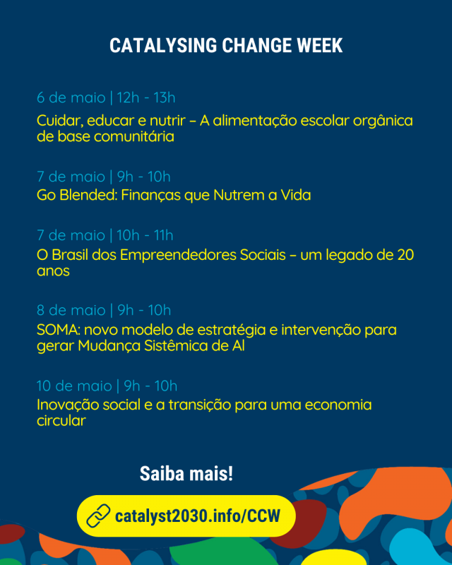 A Catalysing Change Week é organizada pelo Catalyst 2030e conta com mais de 250 sessões e atividades propostas por pessoas de diferentes partes do mundo. O objetivo é identificar soluções locais para questões globais e ampliar o debate e o conhecimento sobre as boas práticas desenvolvidas mundialmente.