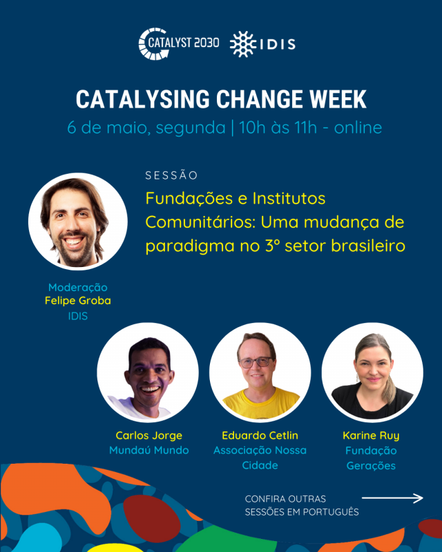 Membro fundador do Capítulo brasileiro do Catalyst 2030, o IDIS, mais uma vez, estará presente no evento. Neste ano, o painel liderado pela organização será “Fundações e Institutos Comunitários: Mudança de paradigma no 3º setor brasileiro”.