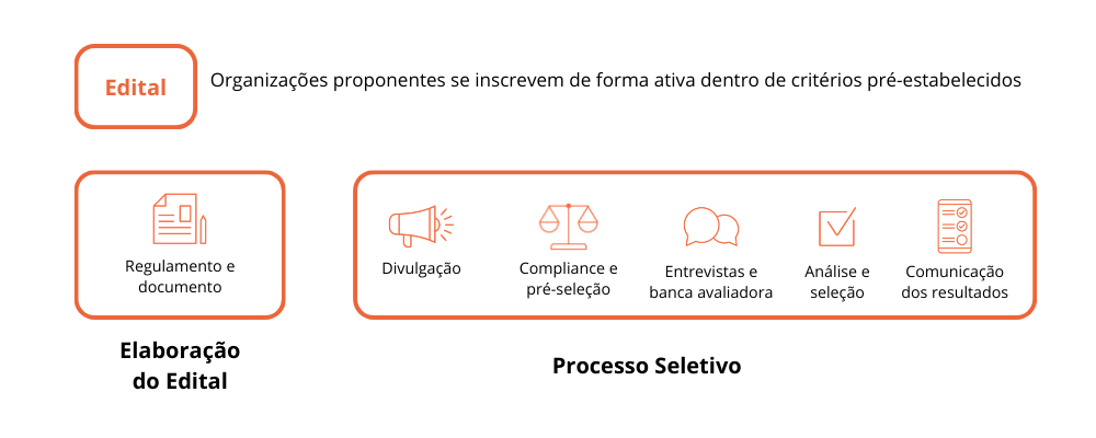 De todas as modalidades, o Edital é o que dá maior ênfase ao processo de seleção. Sua estrutura documental é orientada para essa fase, estabelecendo diretrizes e instrumentos de avaliação para escolha das organizações e iniciativas inscritas e garantindo que, ao final do processo, os resultados sejam públicos.