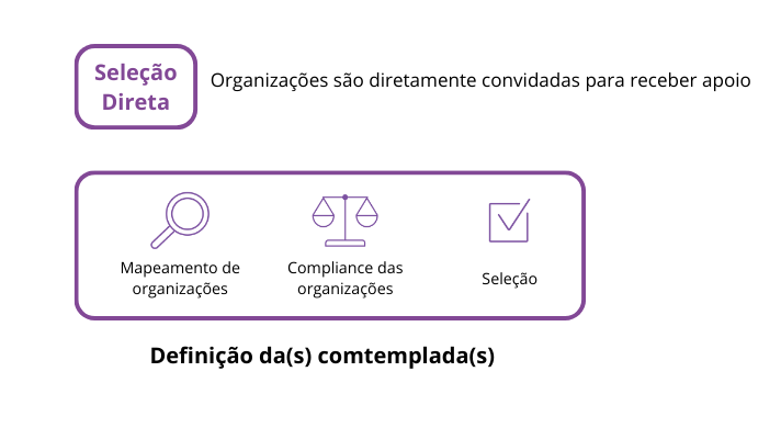A terceira ferramenta é a modalidade de seleção direta. Diferentemente das anteriores, esta contém uma escolha de financiamento mais simplificada, como já indica o próprio nome. Aqui, o processo de seleção é completamente internalizado. O doador realiza um mapeamento prévio de organizações e iniciativas que, após a aprovação das mesmas no processo de compliance, recebem o aporte por repasse direto – se assim desejar..