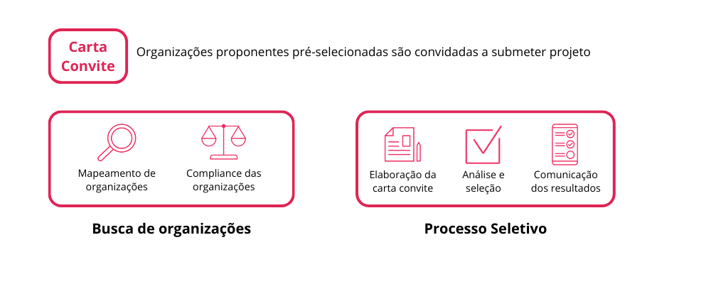 Na carta convite, o doador assume uma postura ativa no mapeamento de organizações. Assim como no Edital, os proponentes passam por um processo de compliance prévio, garantindo que todas as organizações previamente mapeadas estejam aptas para o aporte.