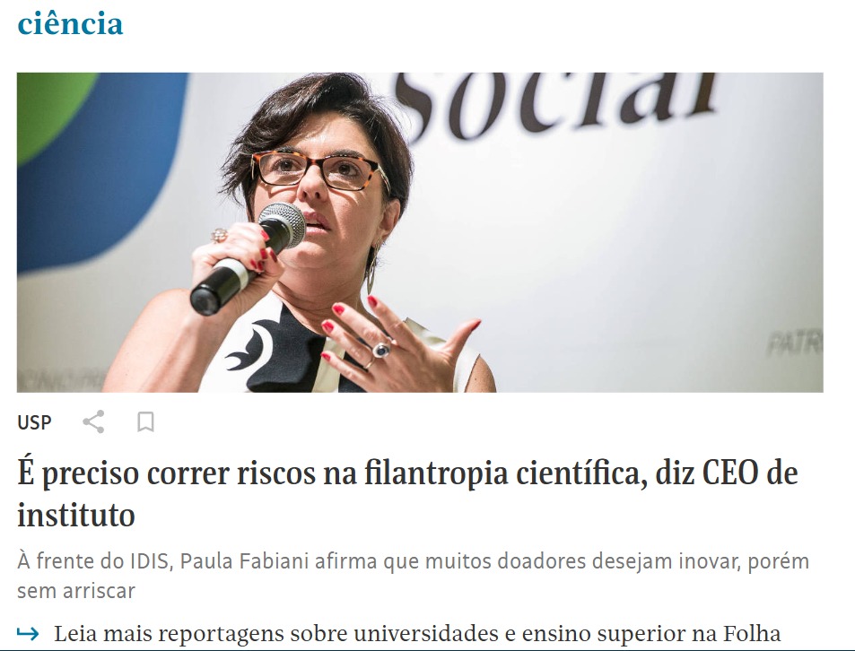 “Há 13 anos, este é um espaço ímpar de troca entre os pares no setor filantrópico brasileiro. É uma excelente oportunidade para nos encontrarmos, discutirmos e refletirmos sobre a filantropia de que precisamos para impactar positivamente o mundo em que vivemos”, Paula Fabiani, CEO do IDIS, em entrevista para o veículo.