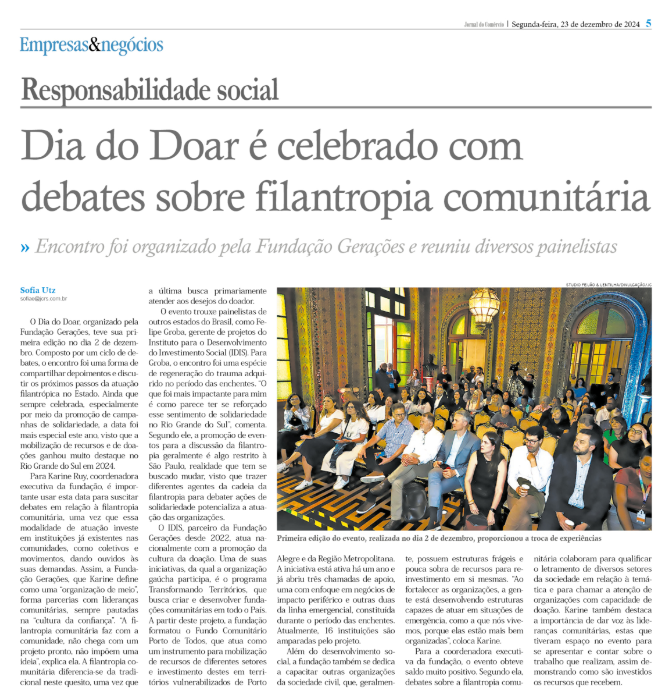 Por isso, doar precisa ser hábito. Doar é investir em um legado para o país e no fortalecimento do papel da sociedade civil organizada como agente essencial no combate às desigualdades. É preciso doar, e precisamos falar sobre isso.
