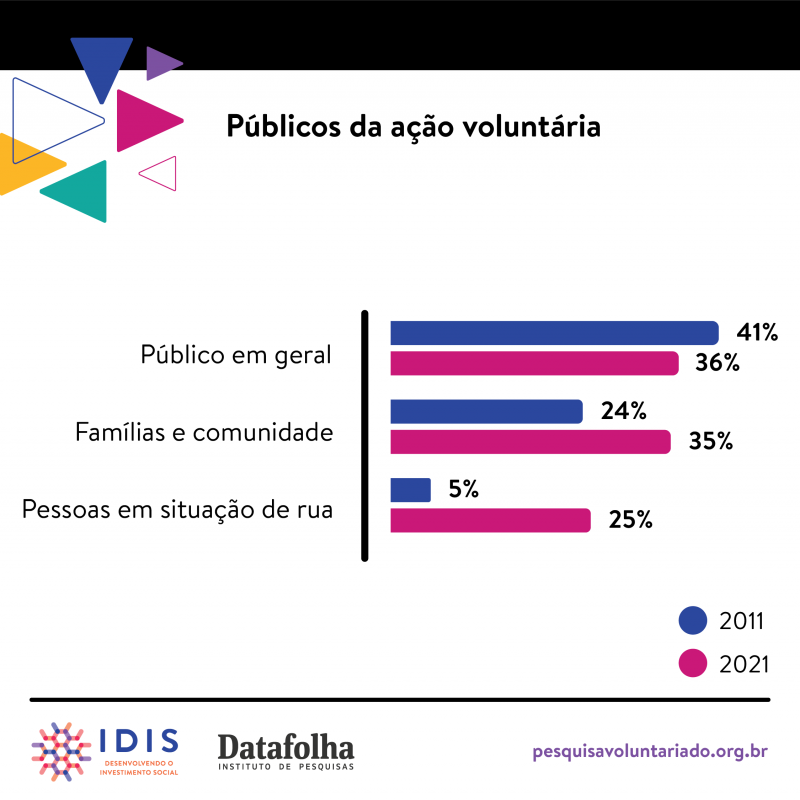 Destacou-se também o aumento da atenção dada a alguns públicos beneficiados pela atividade voluntária. Tiveram forte crescimento em 2021 famílias e comunidades, de 12% em 2011 para 35% em 2021, e pessoas em situação de rua, com um aumento de 20 pontos percentuais em relação à pesquisa anterior. Além disso, a pesquisa mostra a valorização da causa animal, de 1% em 2011 para 9% em 2021, e de pessoas com deficiência, de 3% para 9%.
