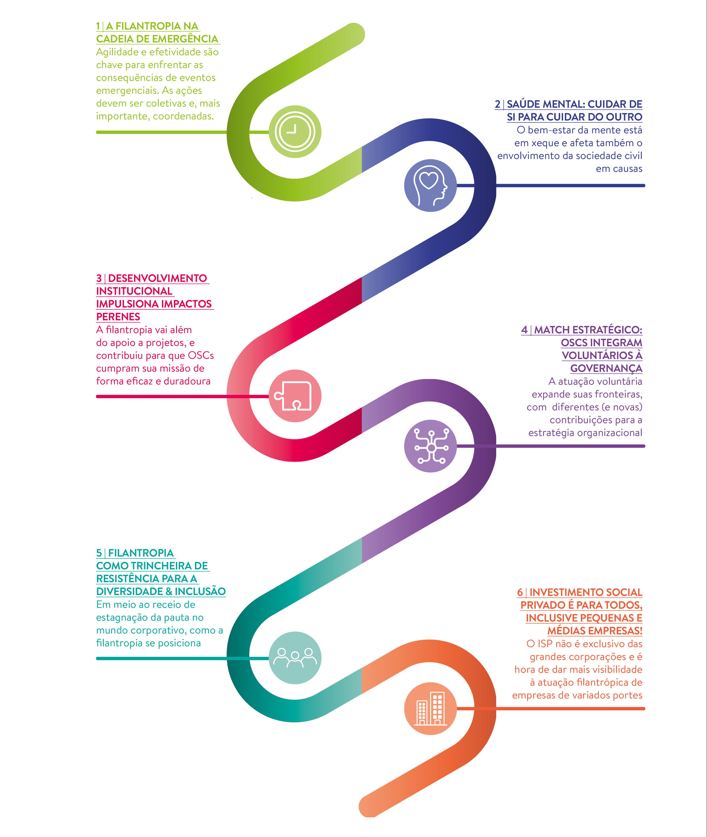 O levantamento, produzido com o objetivo de fortalecer e projetar o futuro da filantropia no Brasil, apresenta seis perspectivas. Entre os temas discutidos, as situações emergenciais continuam como um ponto de atenção pelo terceiro ano. A saúde mental também aparece como mais uma das prioridades, a partir da compreensão de que, quando o bem-estar mental está comprometido, isso também impacta o engajamento da sociedade civil em causas sociais. A temática de Diversidade & Inclusão é outra que surge no relatório em meio a controvérsias e ao aparente esfriamento dessa pauta no universo corporativo.