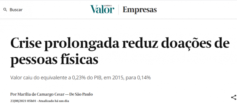 Com base em dados da Pesquisa Doação Brasil 2020, o Valor Econômico destacou como a crise econômica agravada pela pandemia afetou as doações realizadas por pessoas físicas em 2020.