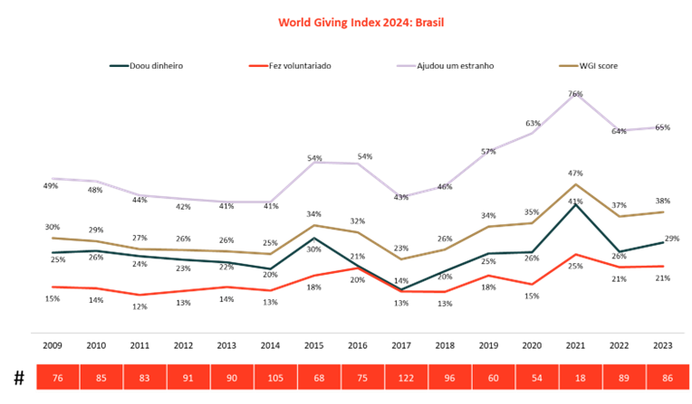 O Brasil subiu três posições em relação ao ano anterior, e agora ocupa o 86º lugar no ranking. Os três indicadores mantiveram-se estáveis, com uma leve melhoria de 3 pontos percentuais no dinheiro doado a organizações da sociedade civil. A ajuda a um estranho ainda é o comportamento predominante, praticado por 65% dos entrevistados. O levantamento, realizado entre setembro e novembro de 2023, não captura as doações realizadas em decorrência da tragédia climática no Rio Grande do Sul. Apesar do Brasil ter ocupado posições melhores no ranking em anos anteriores, esta foi a segunda melhor pontuação conquistada – 38%. O pico aconteceu em 2021, ainda sob os efeitos da pandemia, quando a generosidade estava em alta e, as formas de participação, seja por meio de doações ou voluntariado, estavam mais evidentes.